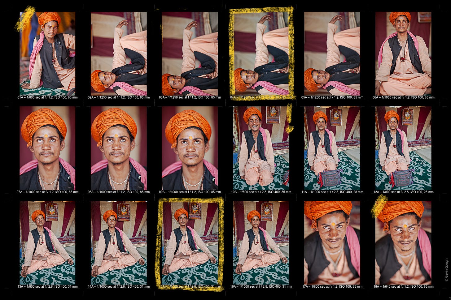 There are nine frames made with an 85mm lens. The first, regrettably, is out of focus! The next four are landscape format, which suited his relaxed posture – and which don’t crop out his left arm. I made four more frames after Ramesh, obligingly, adopted a more formal pose, turning his gaze skyward, but they’re ambiguous. Is he praying, looking at the roof of his tent, meditating, or in a trance?