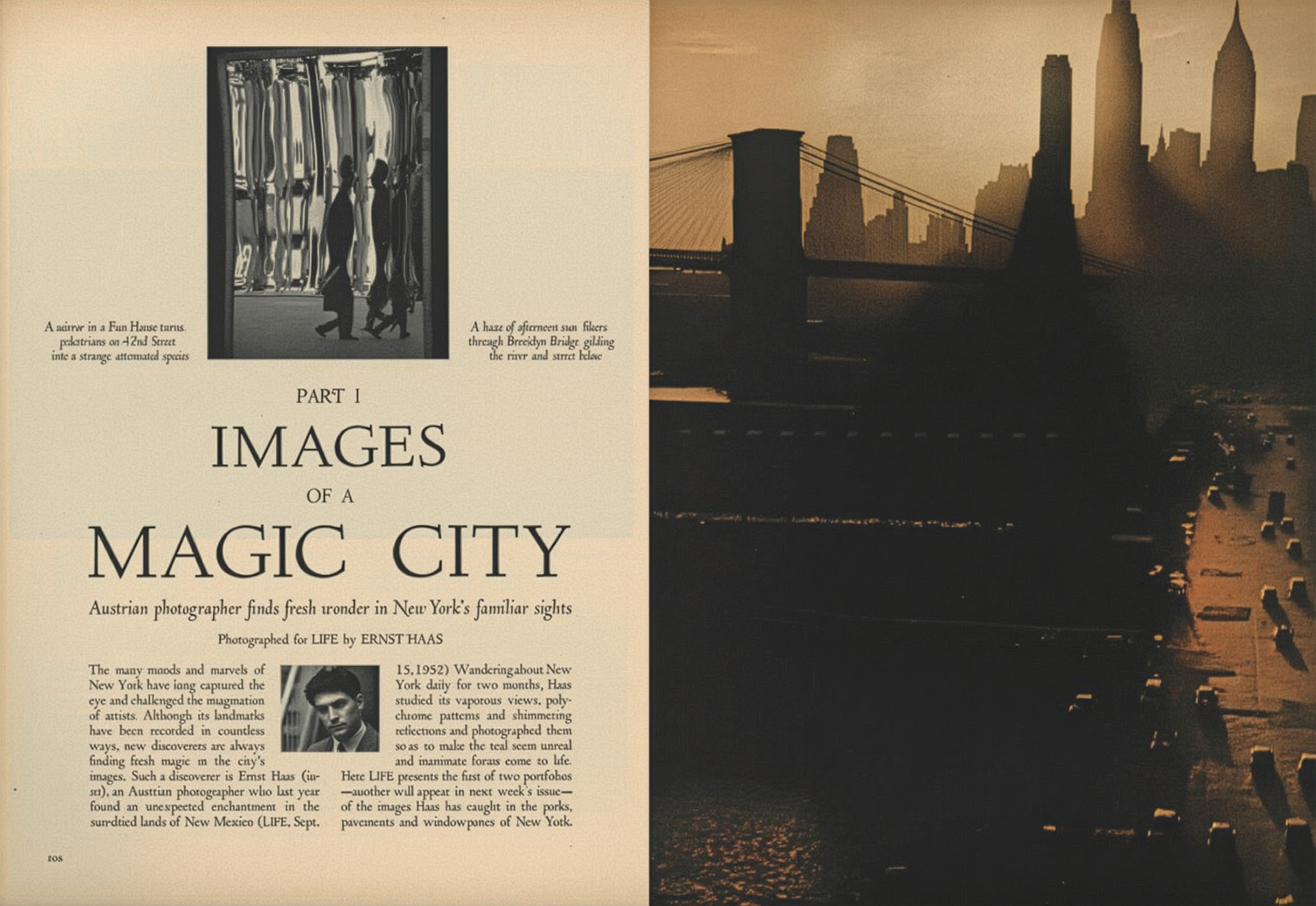In 1953, Life Magazine commissioned Haas to produce a series of colour pictures in New York. He spent two months making largely abstract photographs that were printed in a 24-page story, Images of a Magic City.