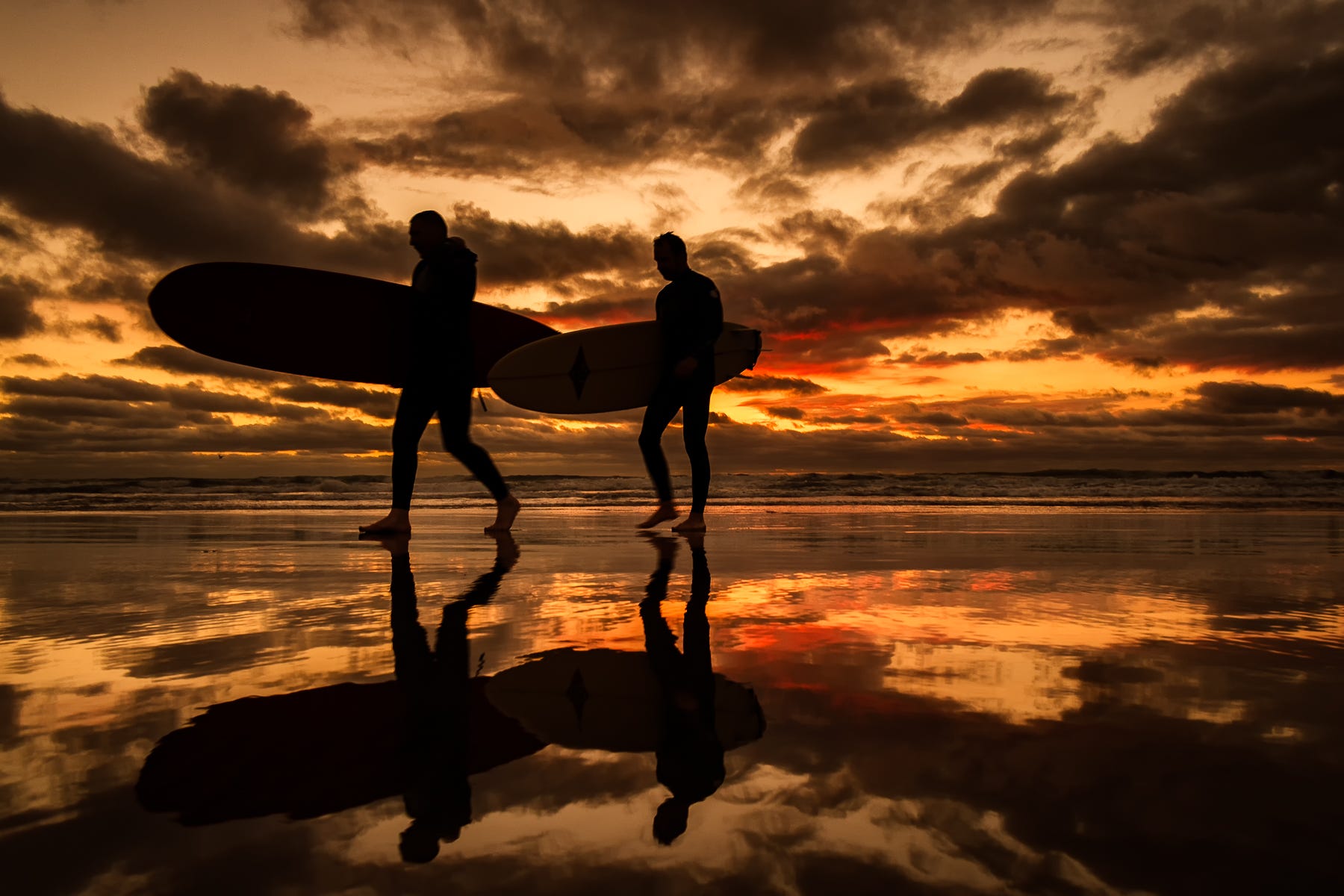 As the sun floated above the horizon, the sky caught fire, mirrored in the tide-washed sand. Two surfers heading home contributed their silhouettes. For me, this image evokes that sense of quiet satisfaction to be found at day’s end, when you’ve spent time in the company of a friend, pursuing your passions, and reached the point at which spoken words are no longer necessary.
