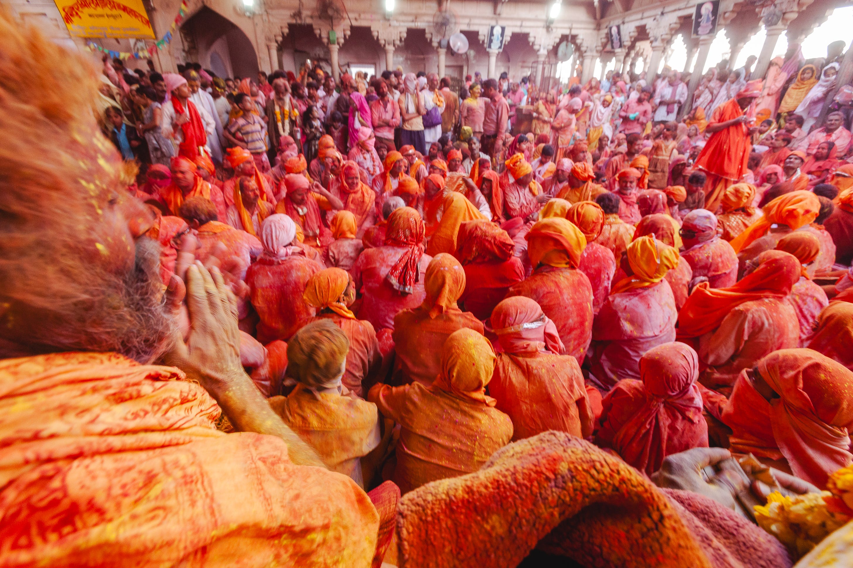 The Radha Rani Temple in Uttar Pradesh is packed. Thousands of devotees are jammed inside, shoulder-to-shoulder. The music is loud, the singing is louder still, the dancing is frenzied, the air is thick with coloured powder, green, yellow, purple.