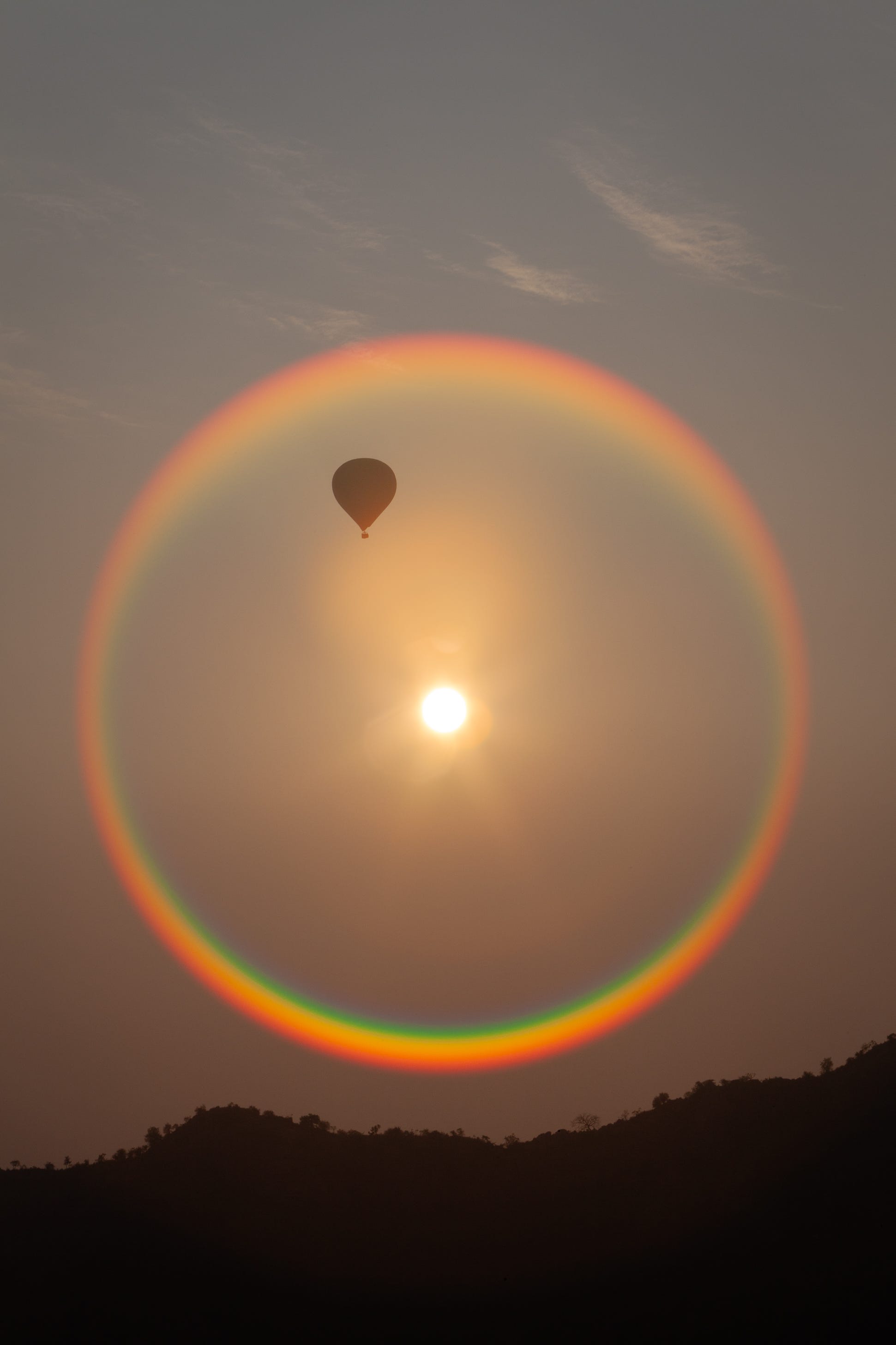Full spectrum solar halos are rare. Rarer still to see another hot-air balloon floating towards the circle of colour. There was little I could do to control our position relative to the other balloon so I could only will it to float closer to the halo. Our pilot sent a burst of flames into our balloon’s canopy and we climbed a few metres, just enough to reach the perfect elevation. As the halo resolved fully, the other balloon descended and I had time to make a single frame.