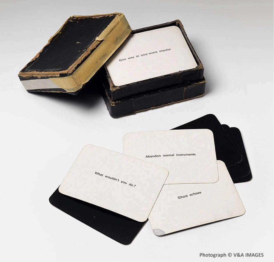 Created in 1975 by Brian Eno and artist Peter Schmidt, Oblique Strategy cards encourage lateral thinking by offering unconventional prompts and creative dilemmas.